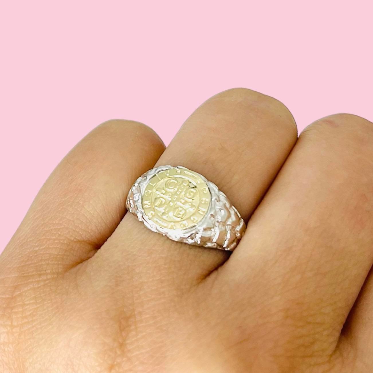 Anillo Sello Chico San Benito Textura Plata y Oro