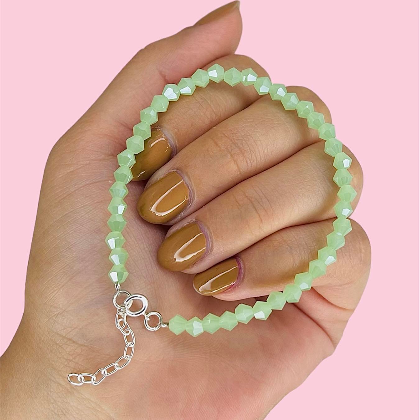 Pulsera cristal Mate Verde Pastel con cadenita forcet colgante