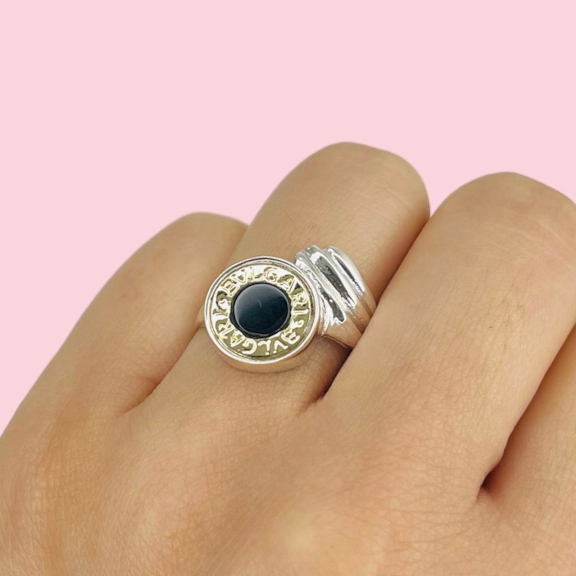 Anillo Bvl Sello Mediano Onda con Onix de Plata y Oro