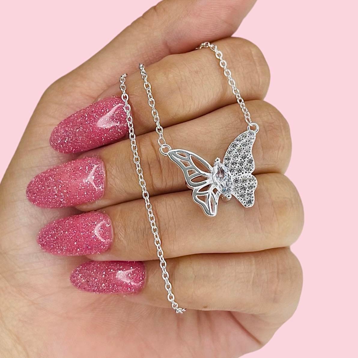 Conjunto Cadena Rolito Dije Mariposa Monarca Marquesita blanca de Plata 925