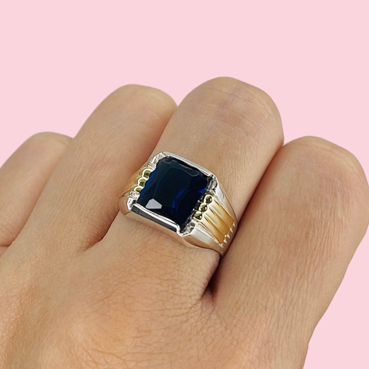 Anillo Sello Rectangulo Azul para Hombre de Plata y Oro