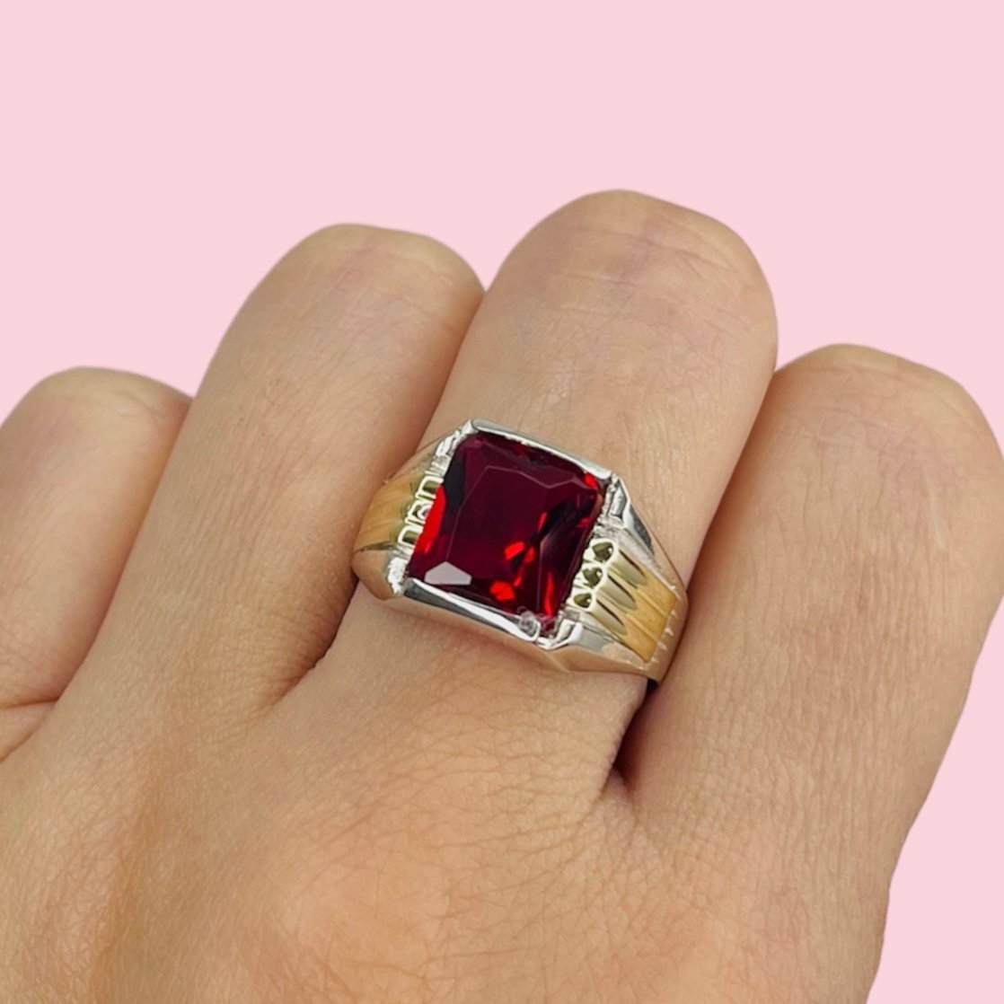 Anillo Sello Rectangulo Rojo para Hombre de Plata y Oro