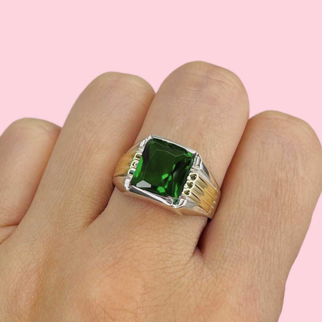 Anillo Sello Rectangulo Verde para Hombre de Plata y Oro