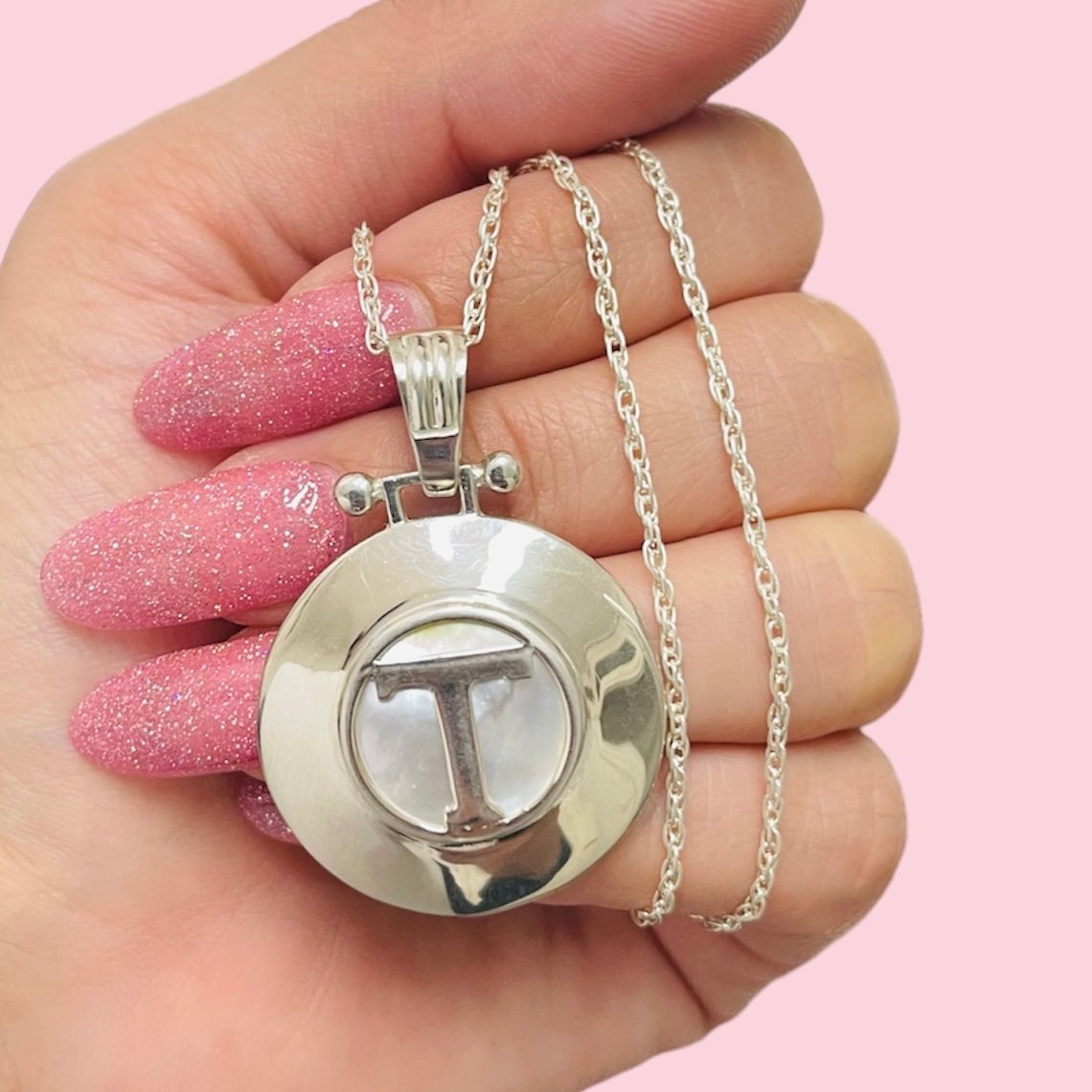Conjunto Cadena Tourbillon 35 con Dije Nacar chico Inicial T de Plata 925