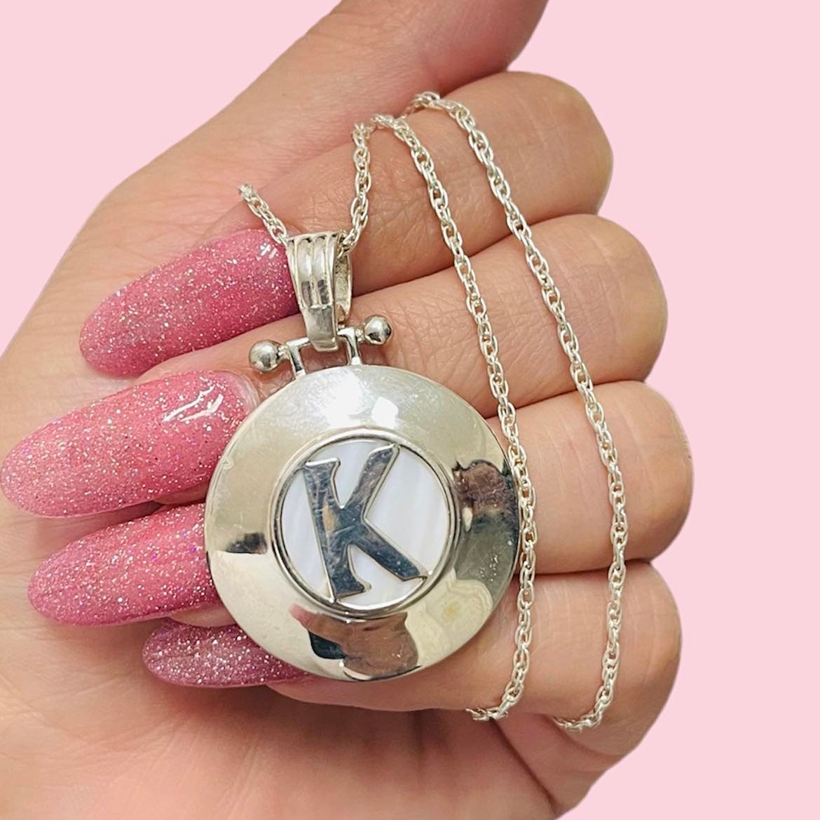 Conjunto Cadena Tourbillon 35 con Dije Nacar chico Inicial K de Plata 925
