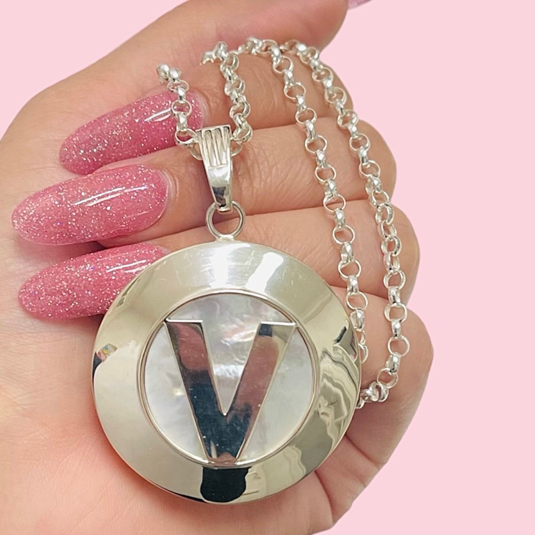 Conjunto Cadena Rolo 0000 con Dije Nacar grande Inicial V de Plata 925