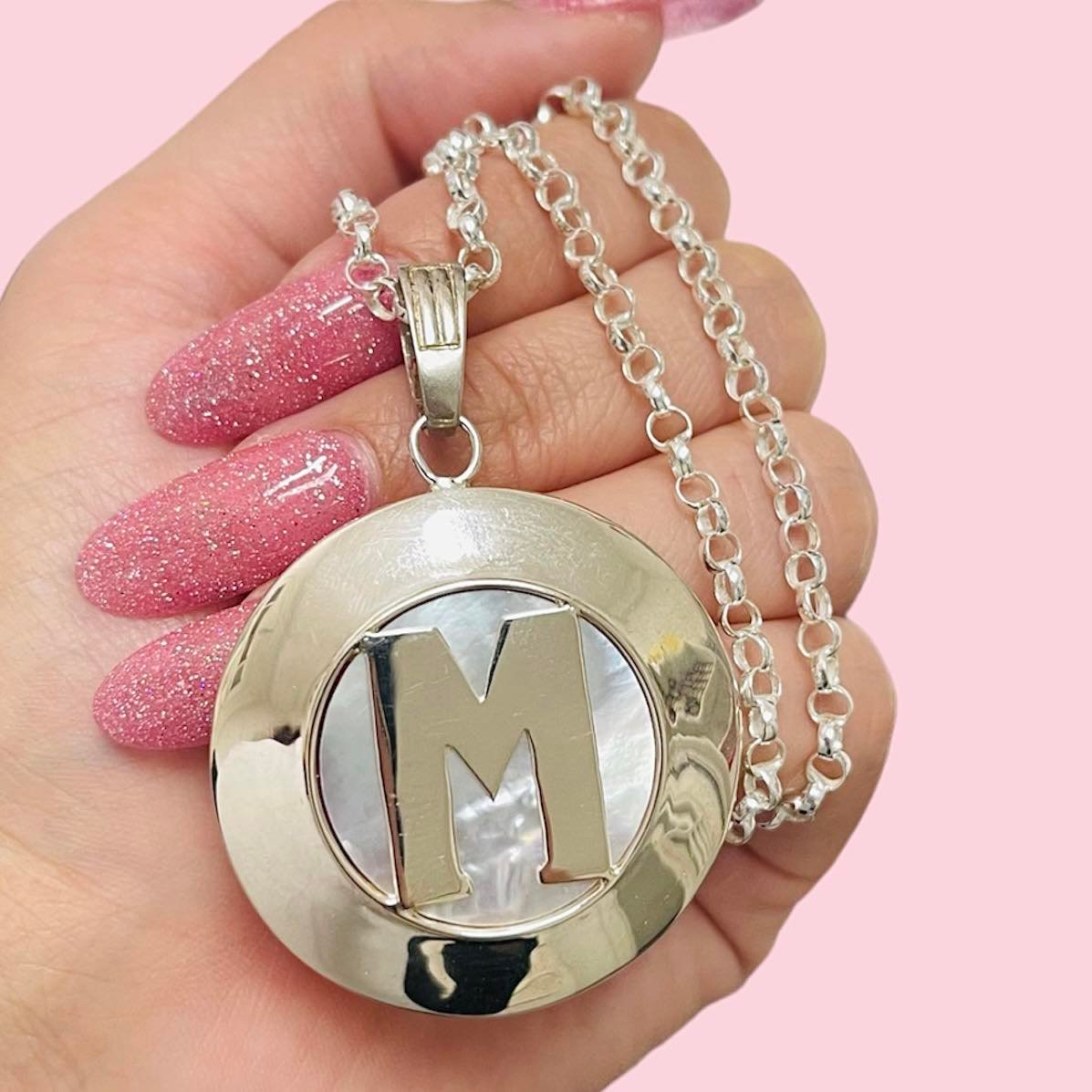 Conjunto Cadena Rolo 0000 con Dije Nacar grande Inicial M de Plata 925