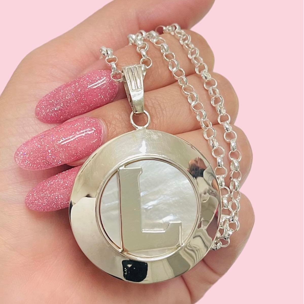 Conjunto Cadena Rolo 0000 con Dije Nacar grande Inicial L de Plata 925