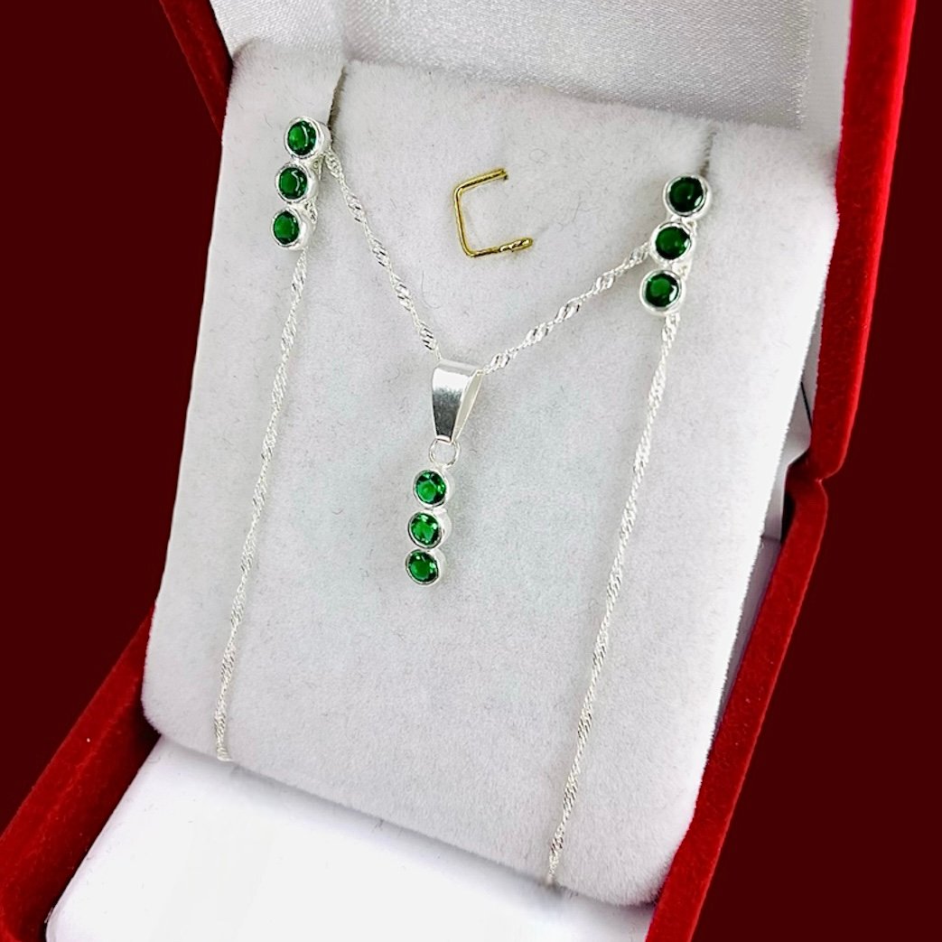 Conjunto Cadena Singapur Fino Aros y Dije Semaforo cubic Verde de Plata 925