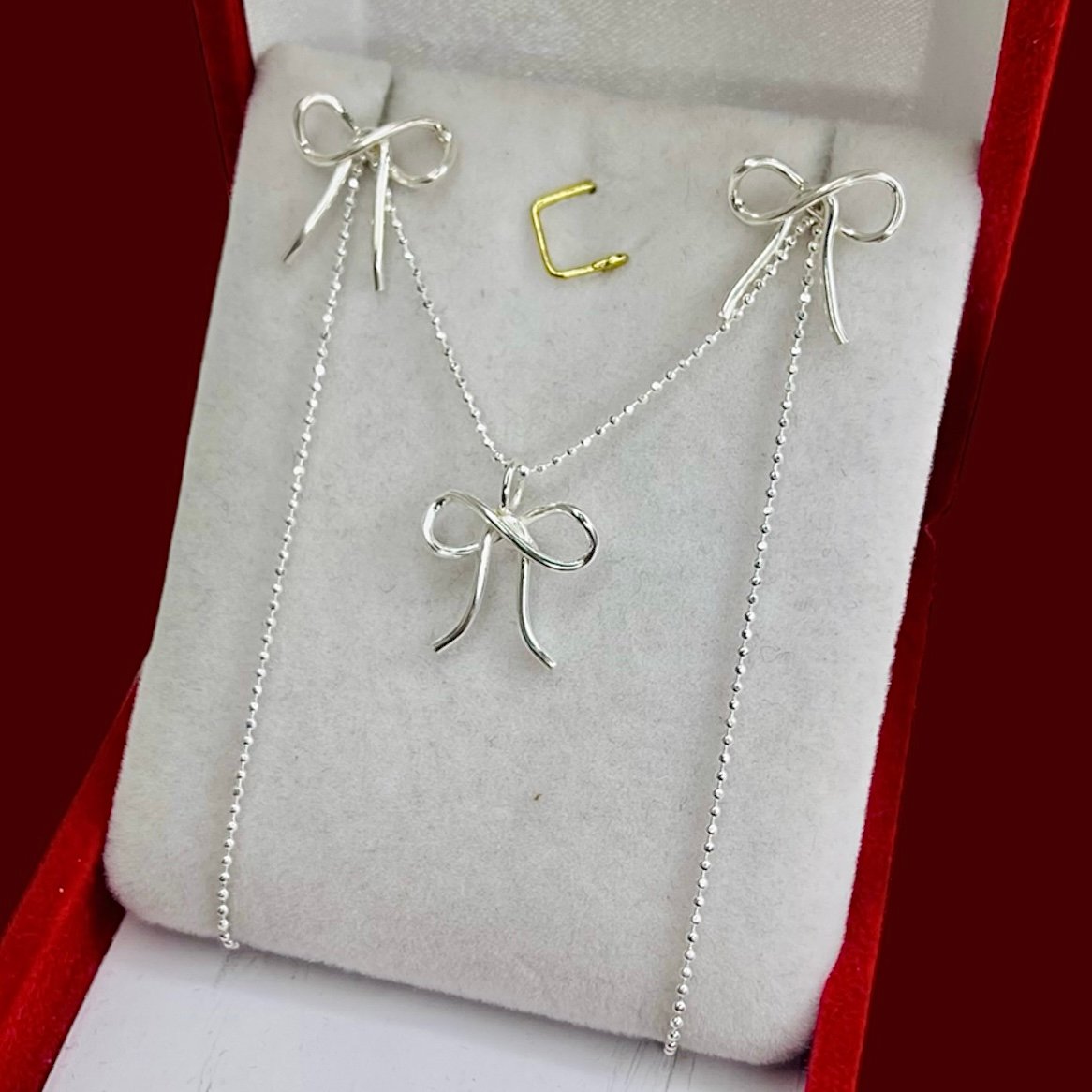 Conjunto Cadena Bolitas Aros y Dije Moño Minimalista de Plata 925