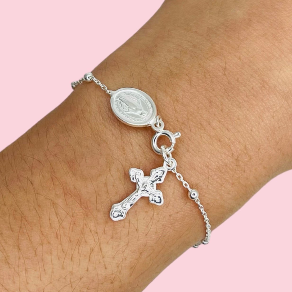 Pulsera Denario Dije Crucifijo y Virgen Milagrosa Plata Italiana