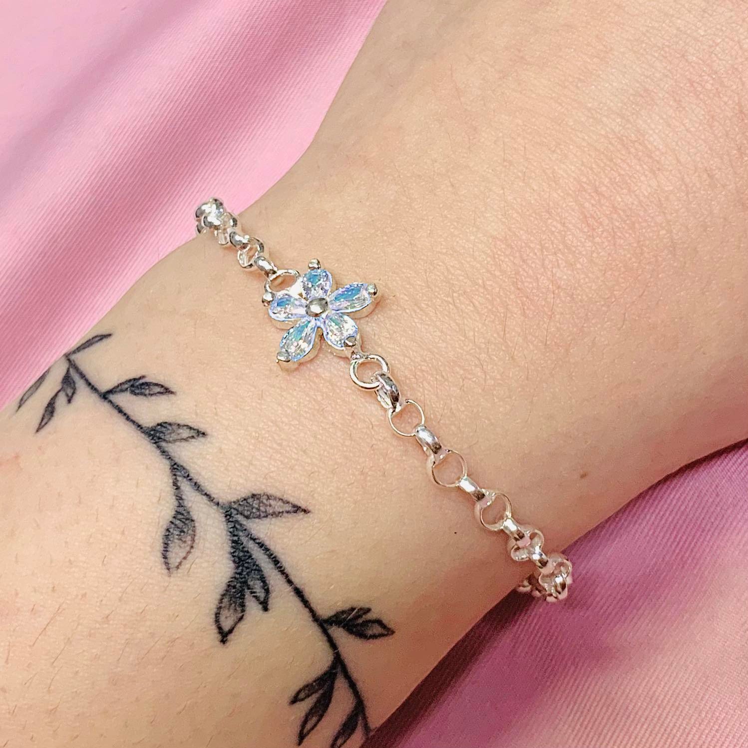 Pulsera Rolo con Flor Margarita Celeste Plata y Oro