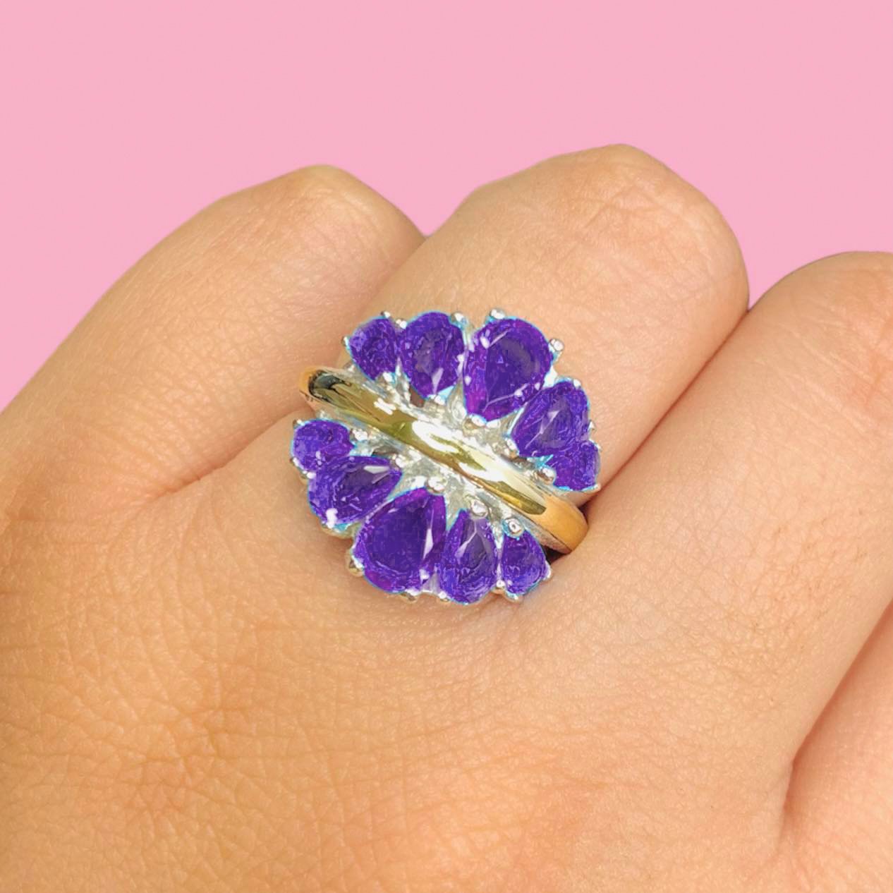 Anillo de reina con cubic gotitas Violeta Plata y Oro