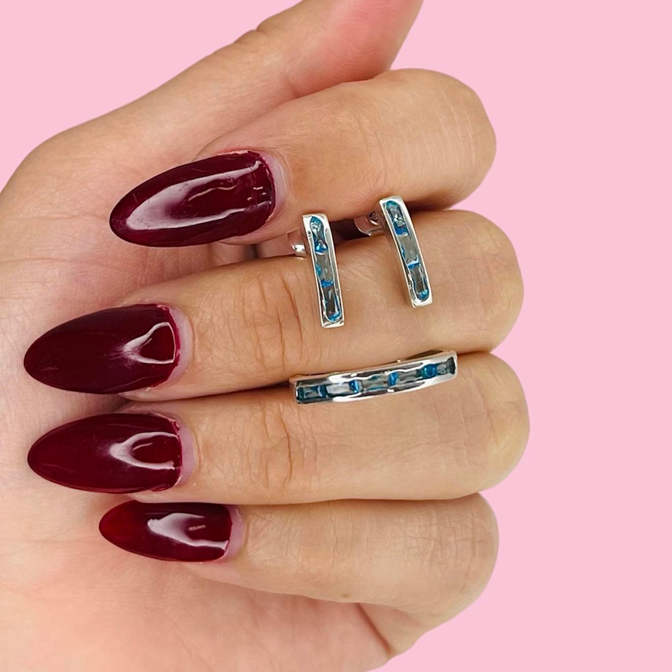 Conjunto Anillo y Aros Medio Sinfin Baguette Celeste de Plata 925
