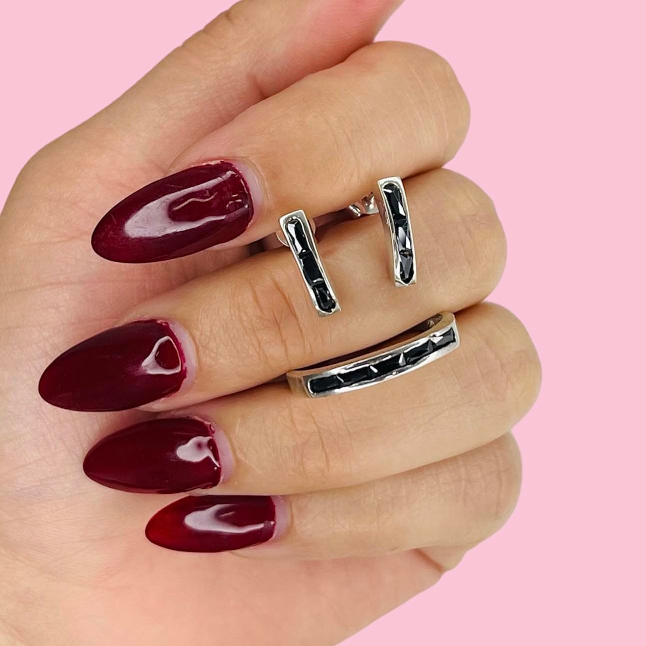 Conjunto Anillo y Aros Medio Sinfin Baguette Negro de Plata 925