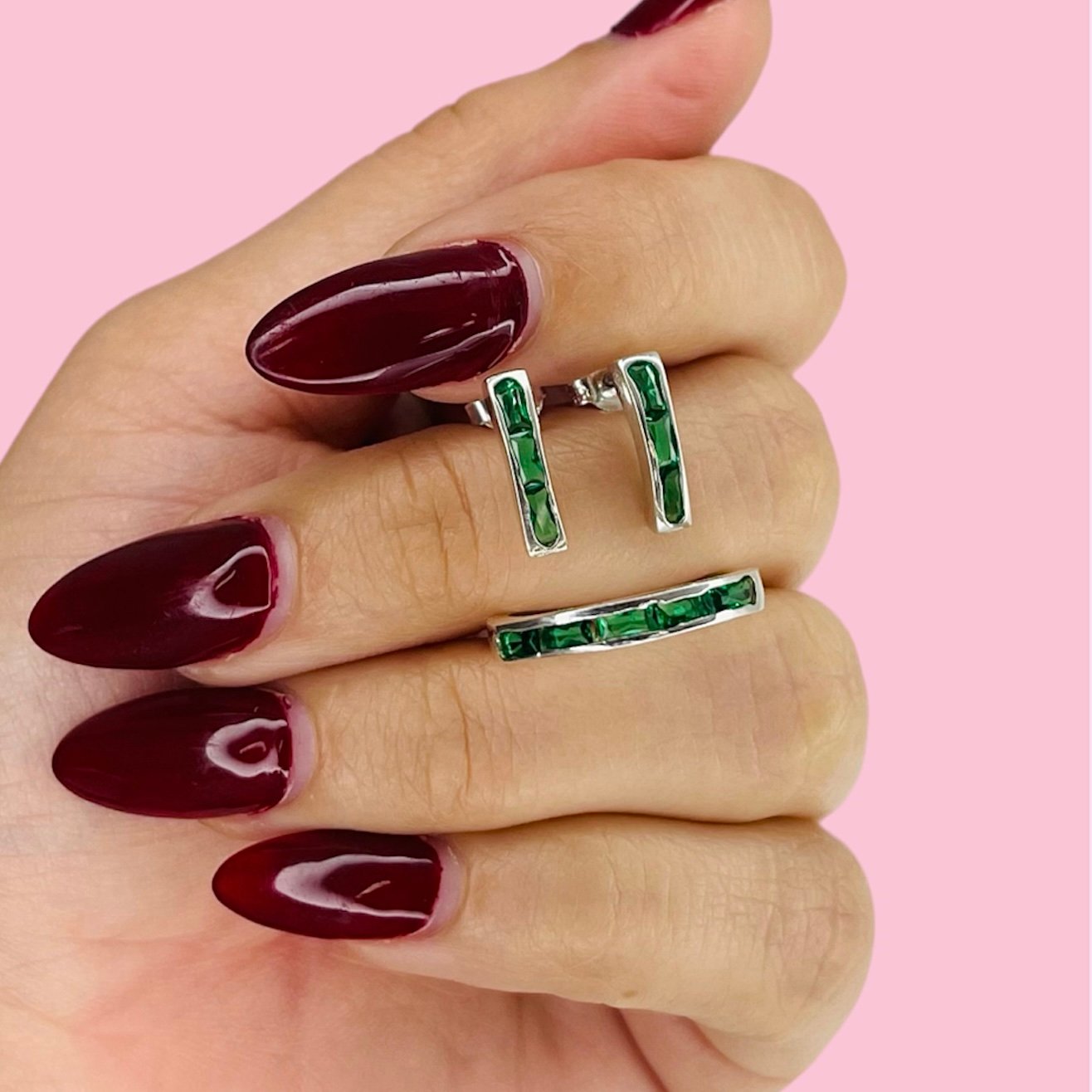 Conjunto Anillo y Aros Medio Sinfin Baguette Verde de Plata 925