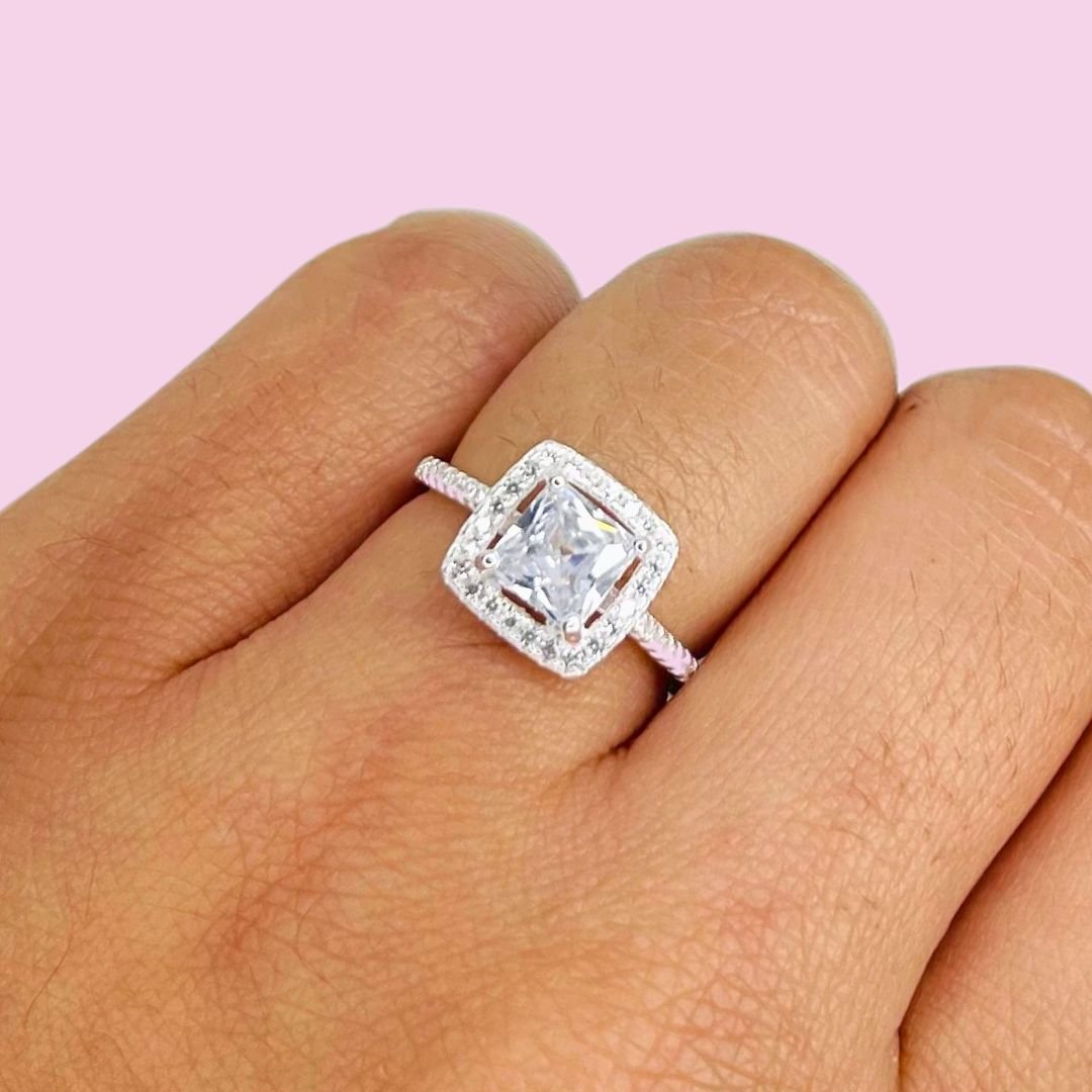 Anillo Compromiso cubic blanco cuadrado con halo de Plata Italiana