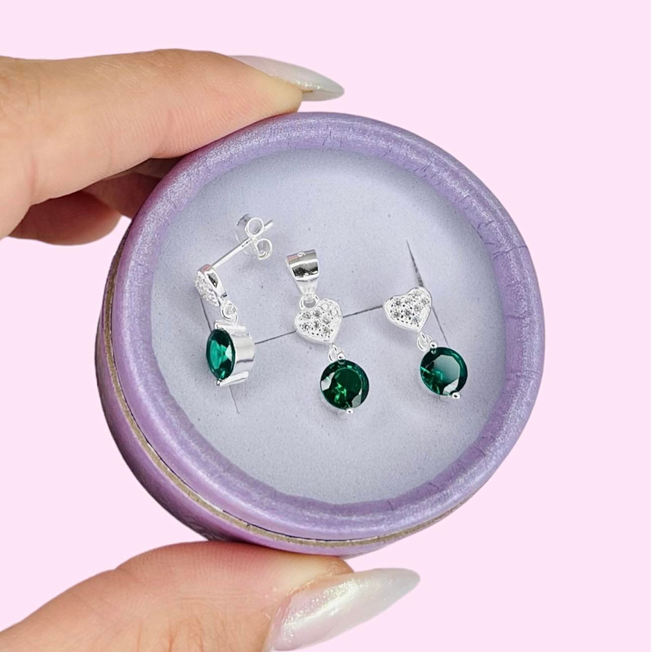 Conjunto aros y dije corazon y cubic verde colgante de Plata 925