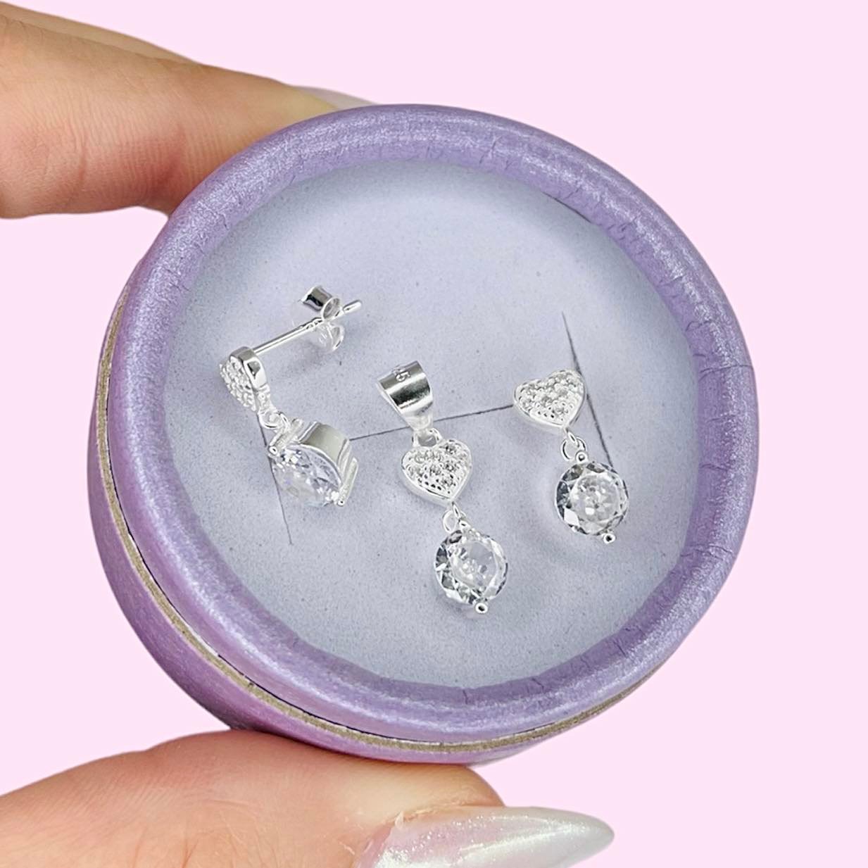 Conjunto aros y dije corazon y cubic blanco colgante de Plata 925