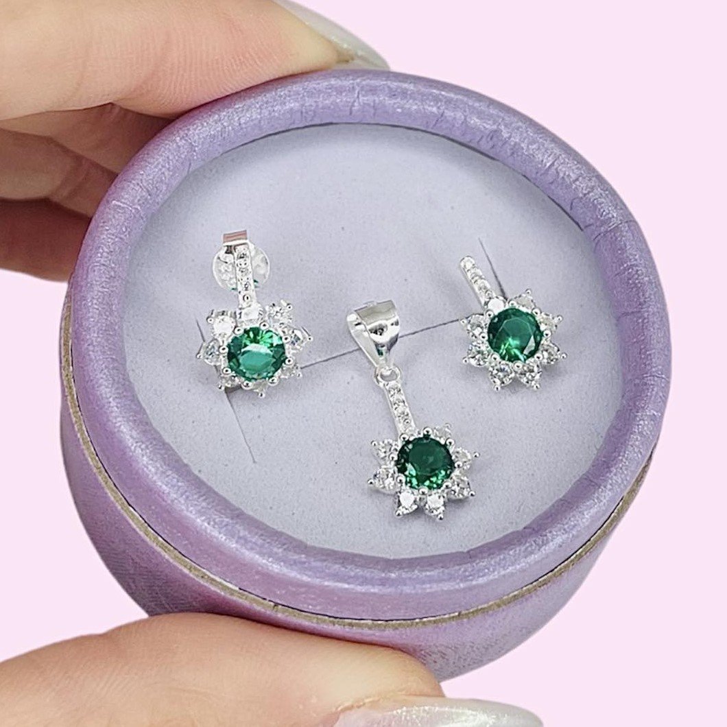Conjunto aros y dije Flor y linea cubic verde y blanco de Plata 925