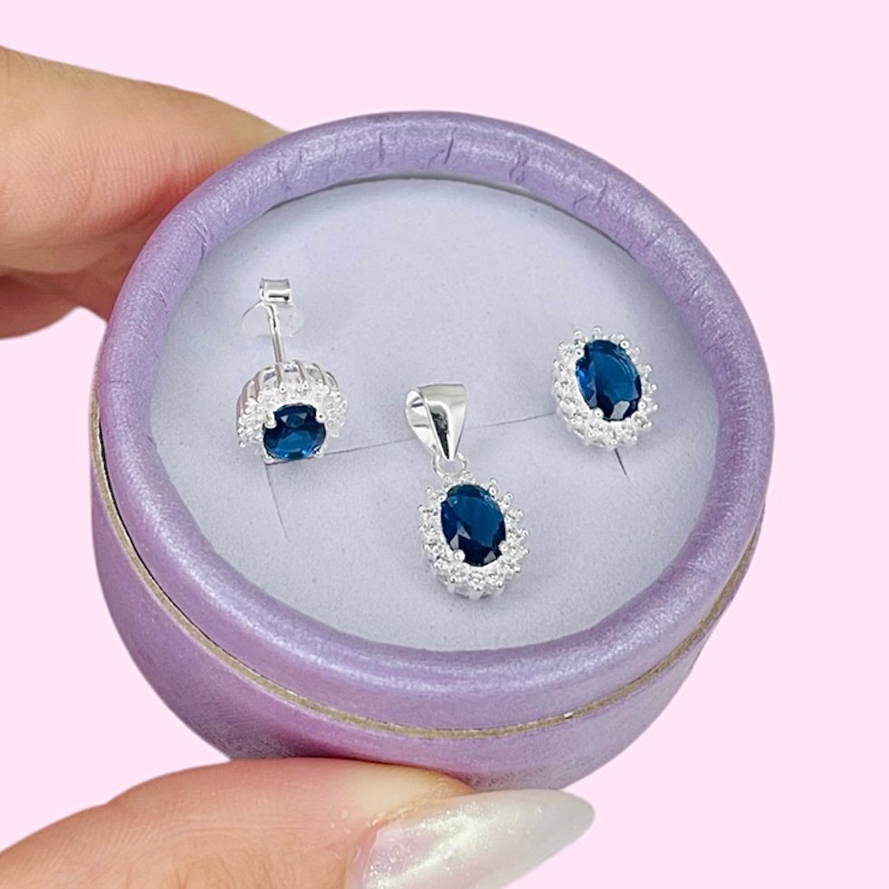 Conjunto aros y dije Oval azul y blanco de Plata 925