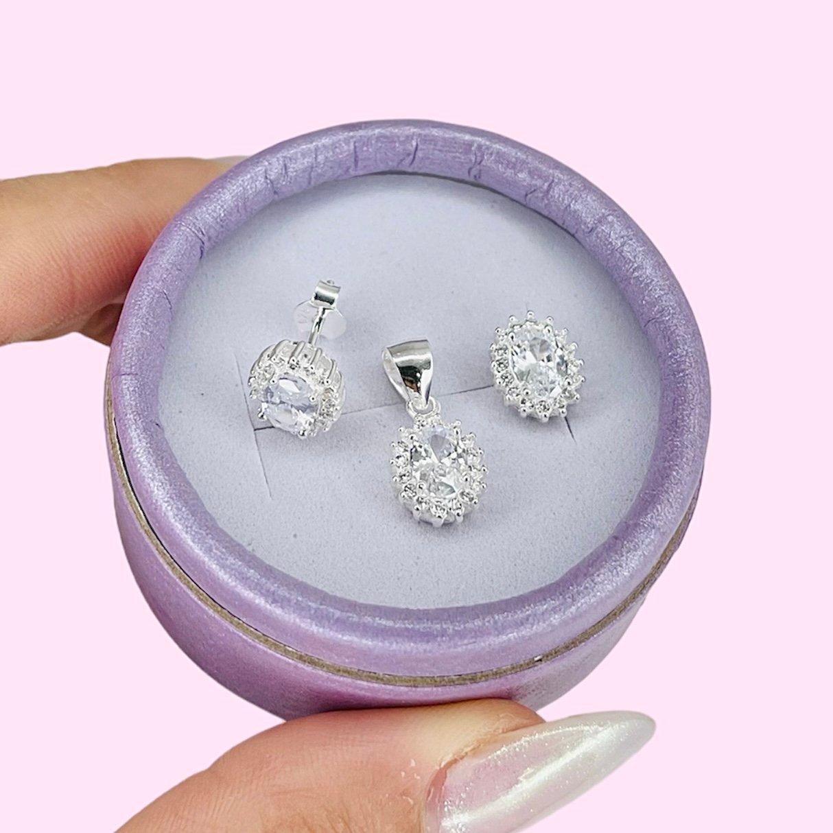 Conjunto aros y dije Oval blanco de Plata 925