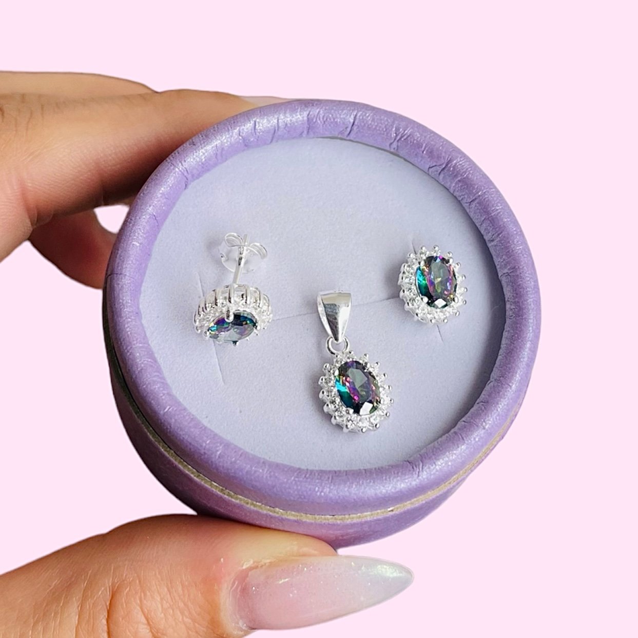 Conjunto aros y dije Oval paradise y blanco de Plata 925