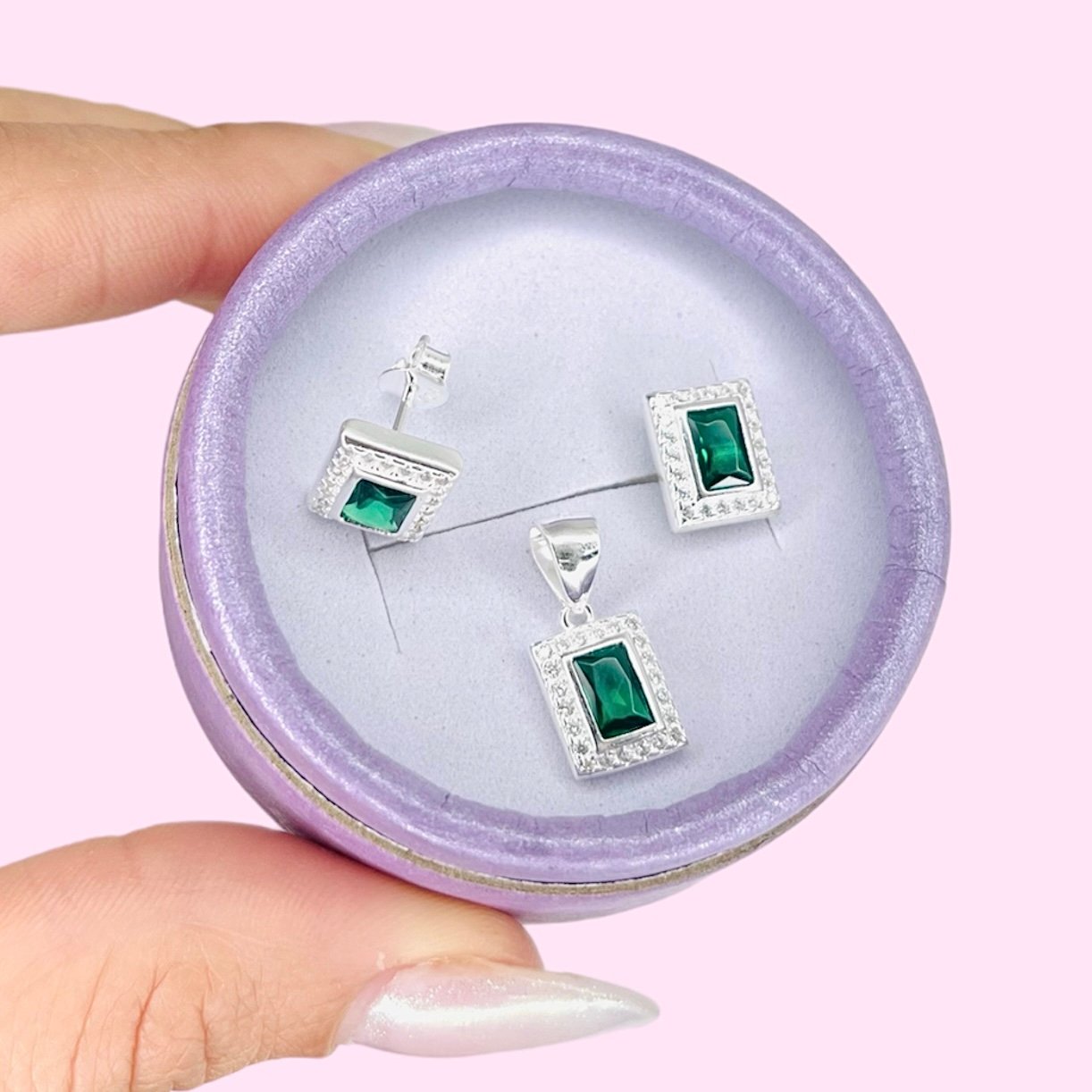 Conjunto aros y dije reinado cubic rectangular verde de Plata 925