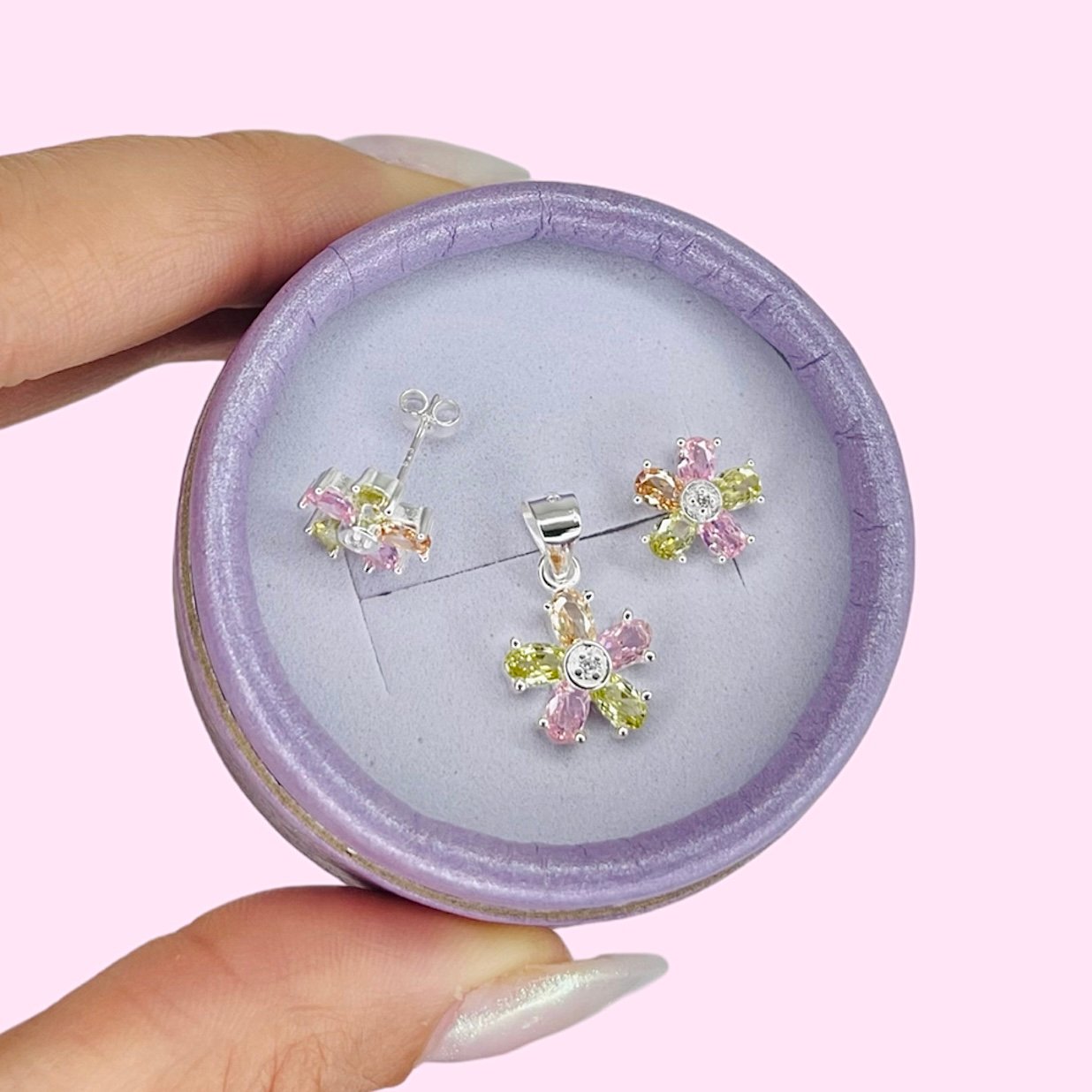 Conjunto aros y dije flor primavera cubic multicolor de Plata 925