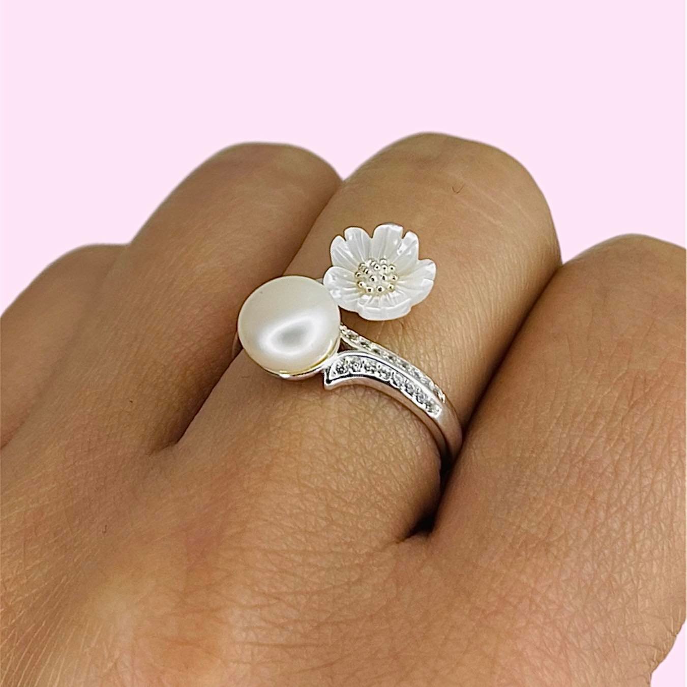 Anillo Flor y perla con cubic blanco micropave de Plata Italiana