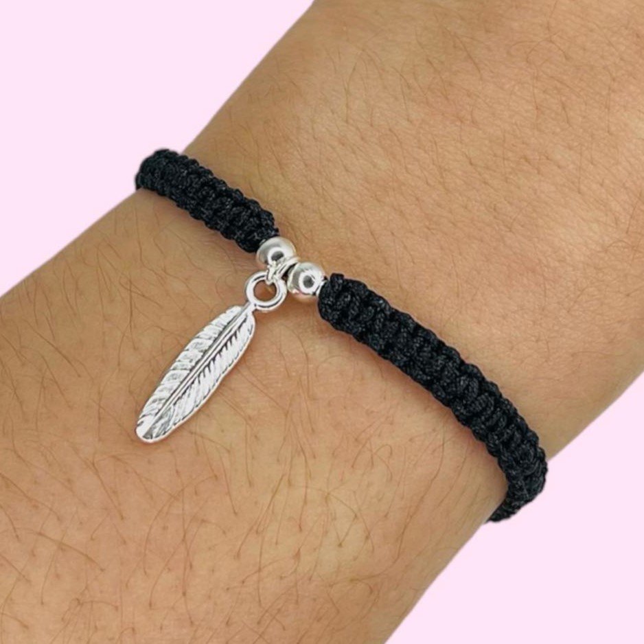 Pulsera hilo negro tejido con dije Pluma y bolitas plateadas