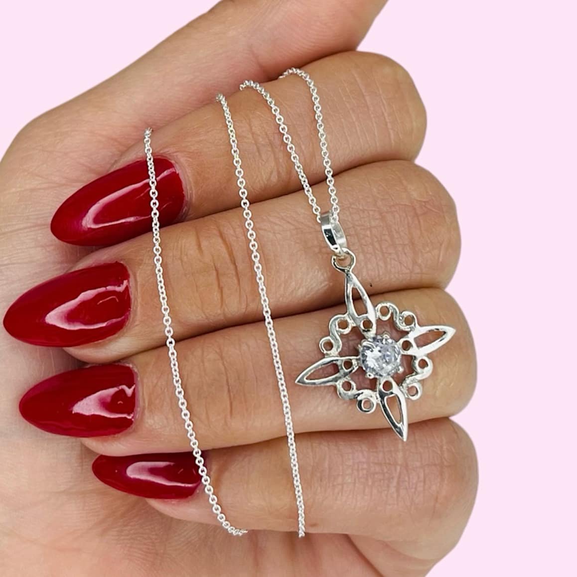 Conjunto cadena rolito y dije nudo de bruja cubic redondo blanco de Plata 925