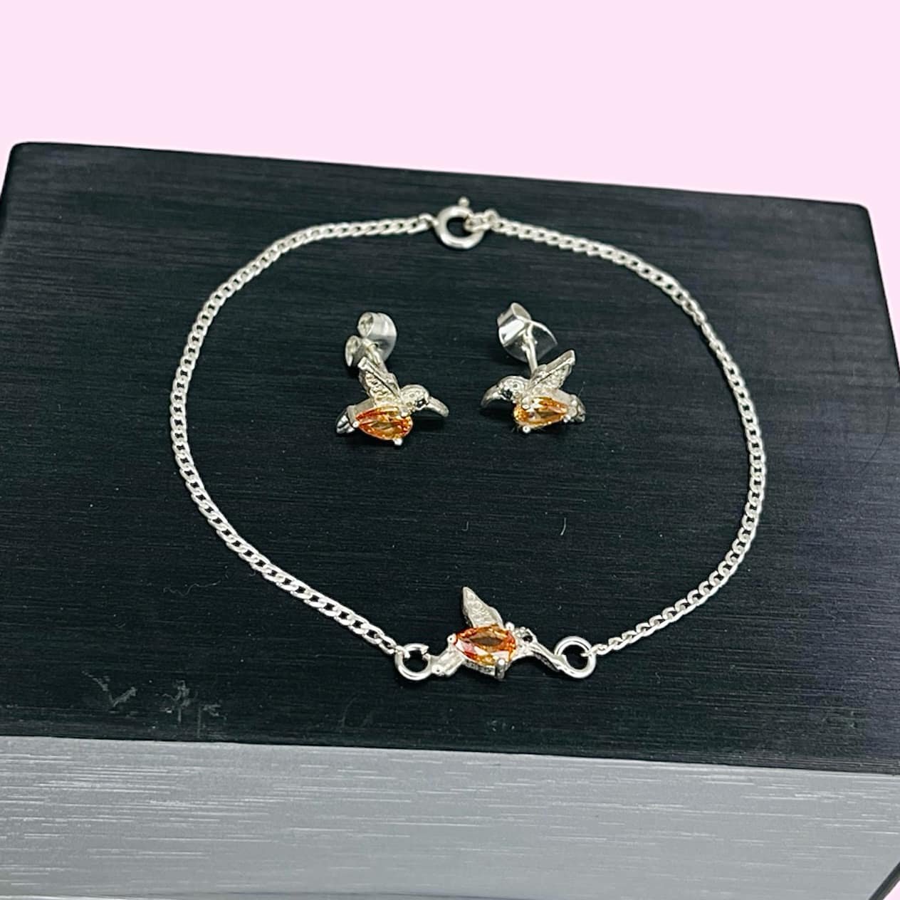 Conjunto pulsera groumet y aros colibri cubic gota ambar de Plata 925