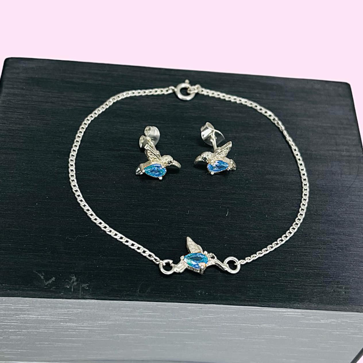 Conjunto pulsera groumet y aros colibri cubic gota Celeste de Plata 925