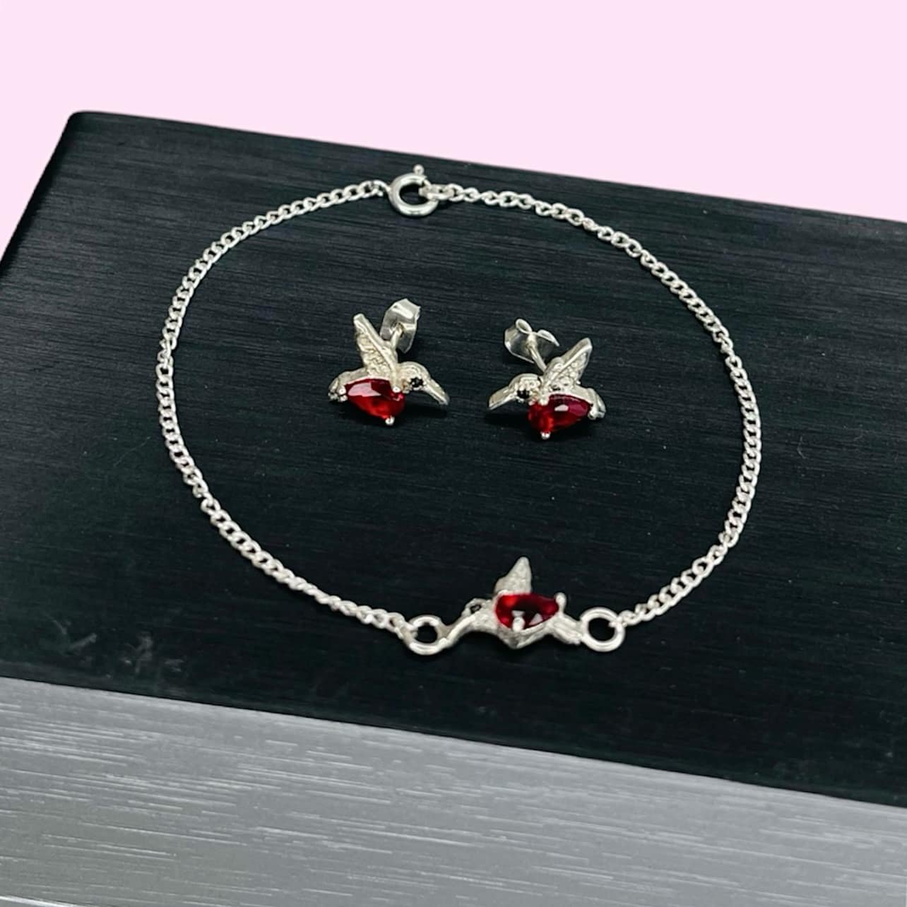 Conjunto pulsera groumet y aros colibri cubic gota rojo de Plata 925