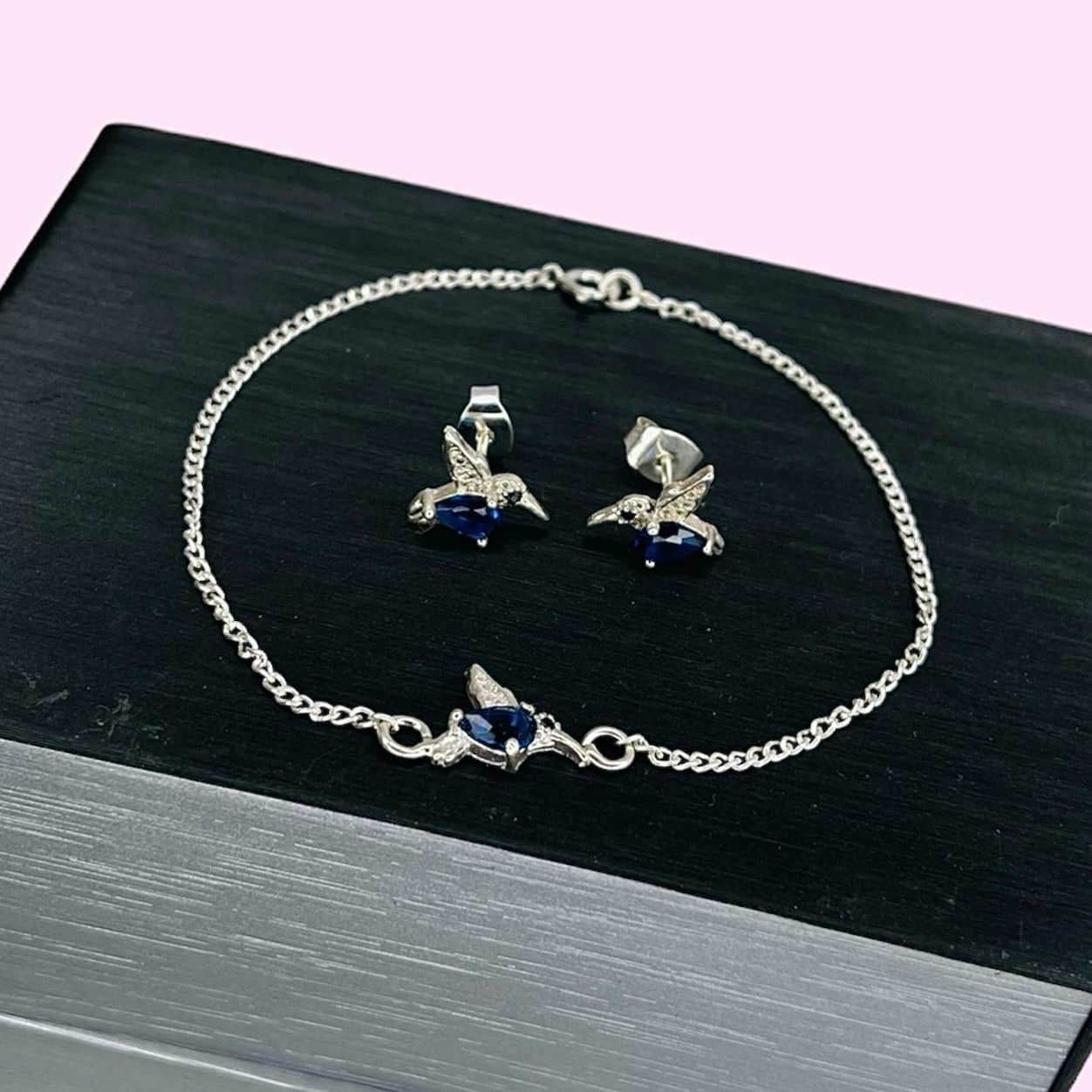 Conjunto pulsera groumet y aros colibri cubic gota azul de Plata 925