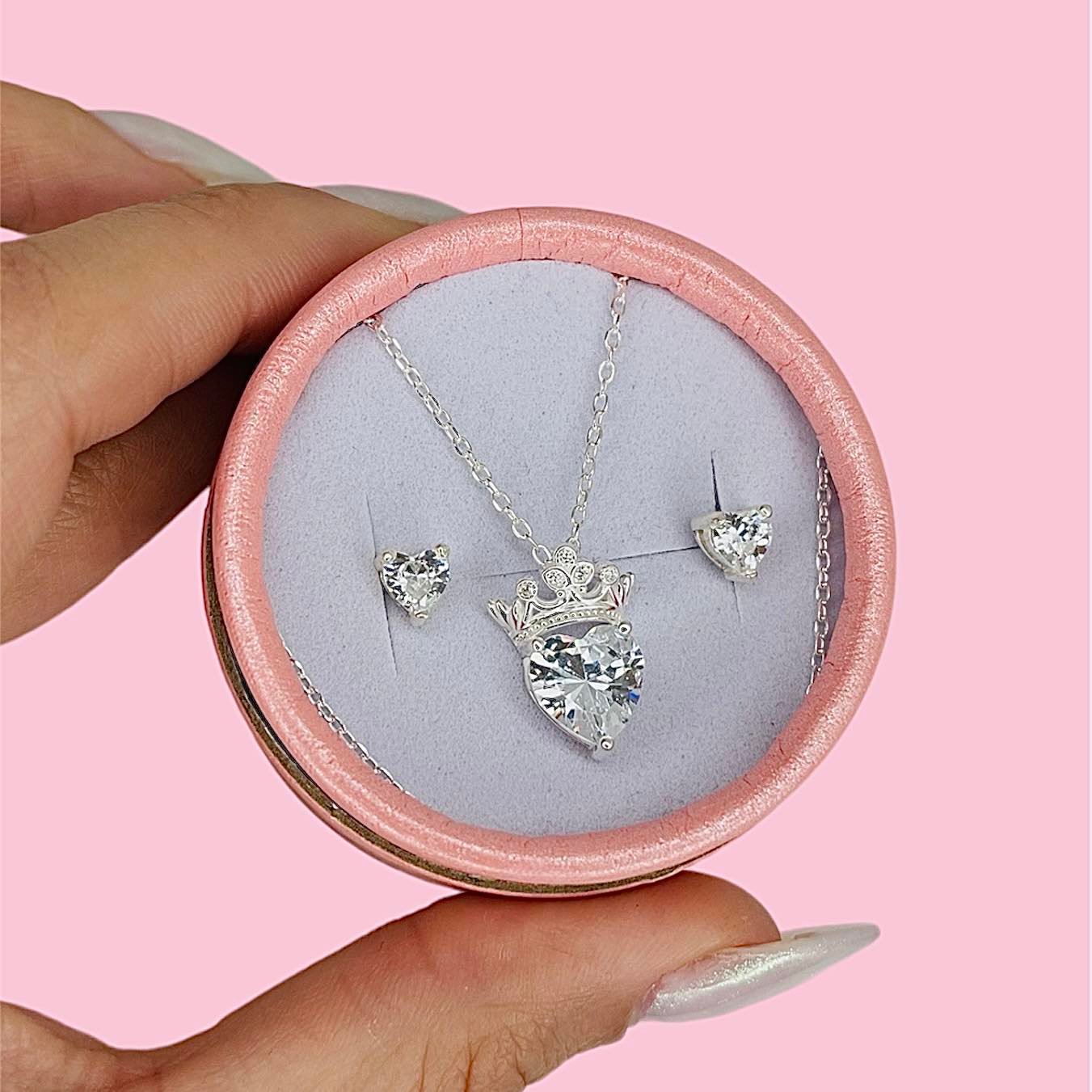 Conjunto Cadena rolito corazon de la realeza y aritos cubic corazon Plata 925