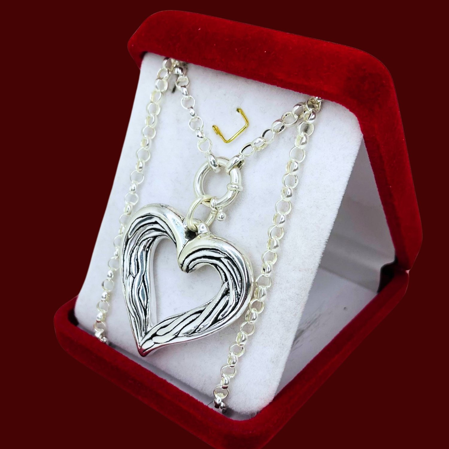 Conjunto cadena rolo N0000 con Dije inflado corazon grande textura madera Plata 925