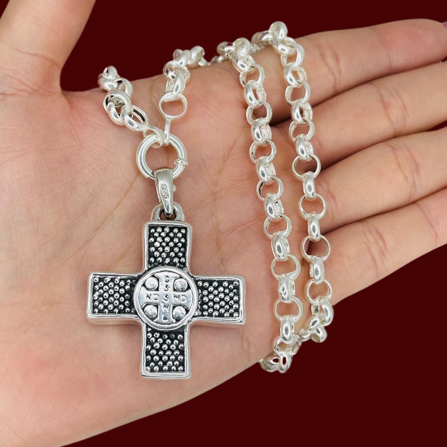Conjunto cadena rolo N1 con Dije inflado de cruz Grande san benito Plata 925