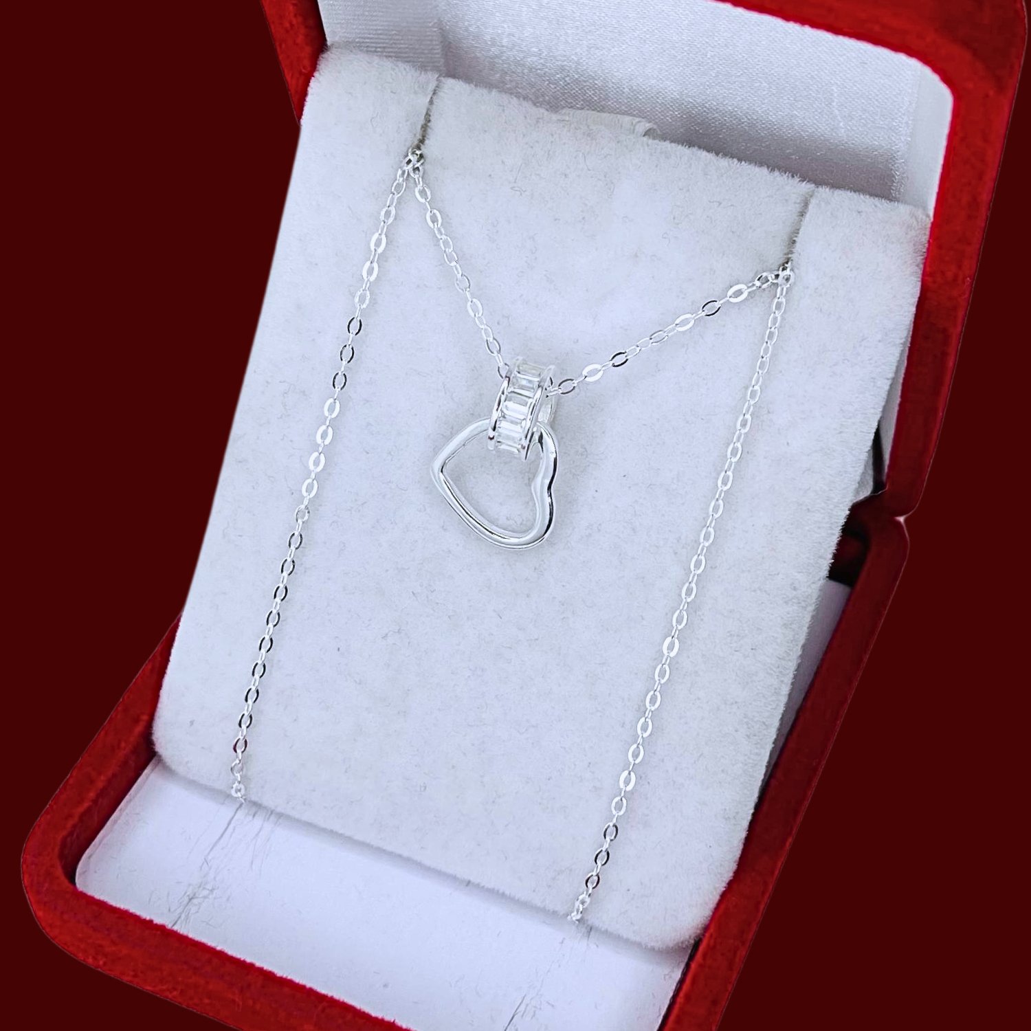 Conjunto cadena espejado dije aro y corazon baguette blanco Plata 925