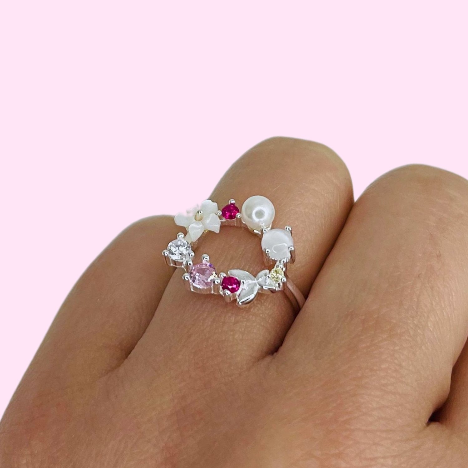 Anillo jardin floral cubic blanco fucsia y rosa de Plata Italiana