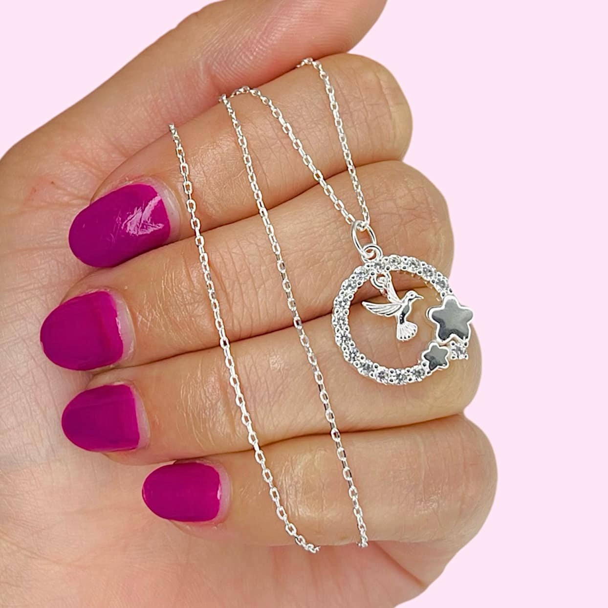 Conjunto cadena rolito dije colibri volador cubic blanco Plata 925