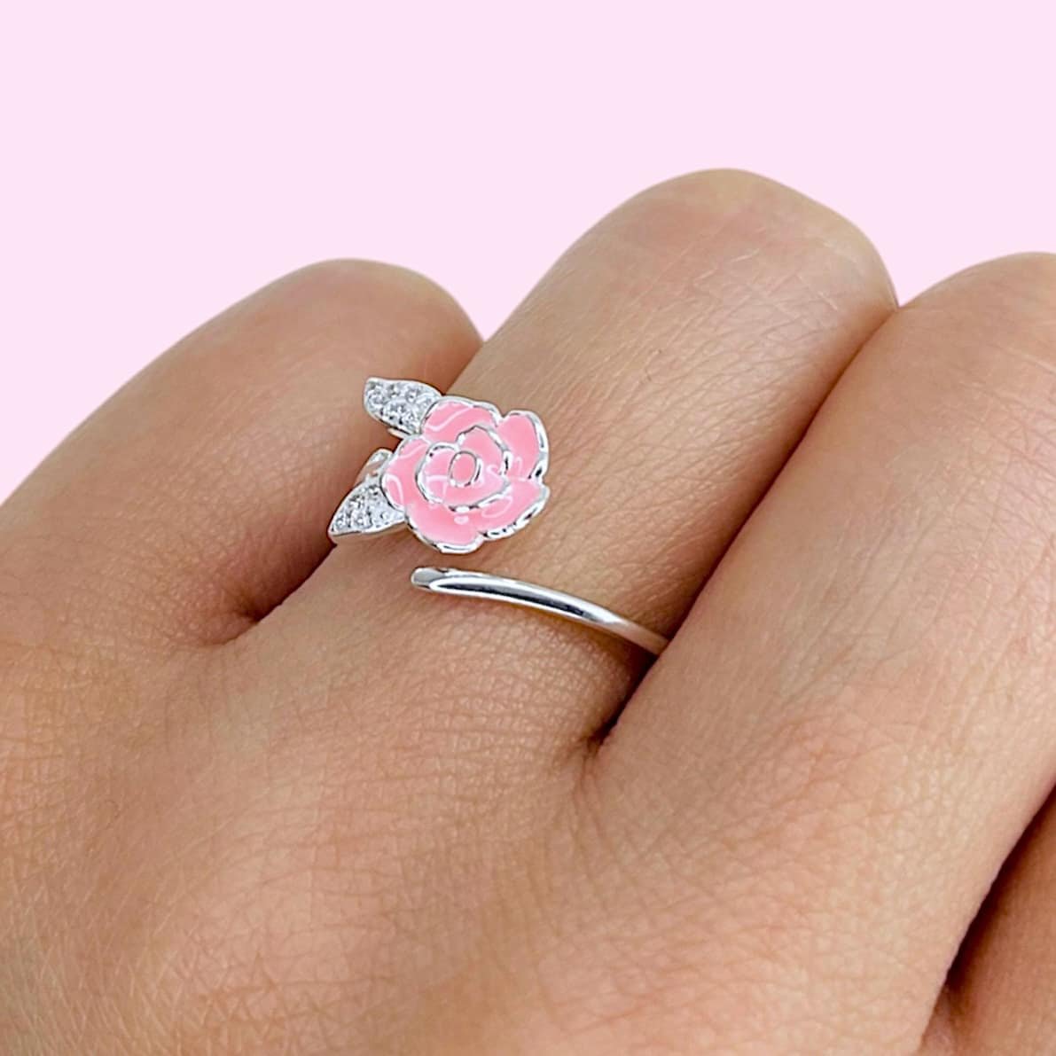 Anillo Flor Rosa esmaltada con cubic blanco de Plata Italiana
