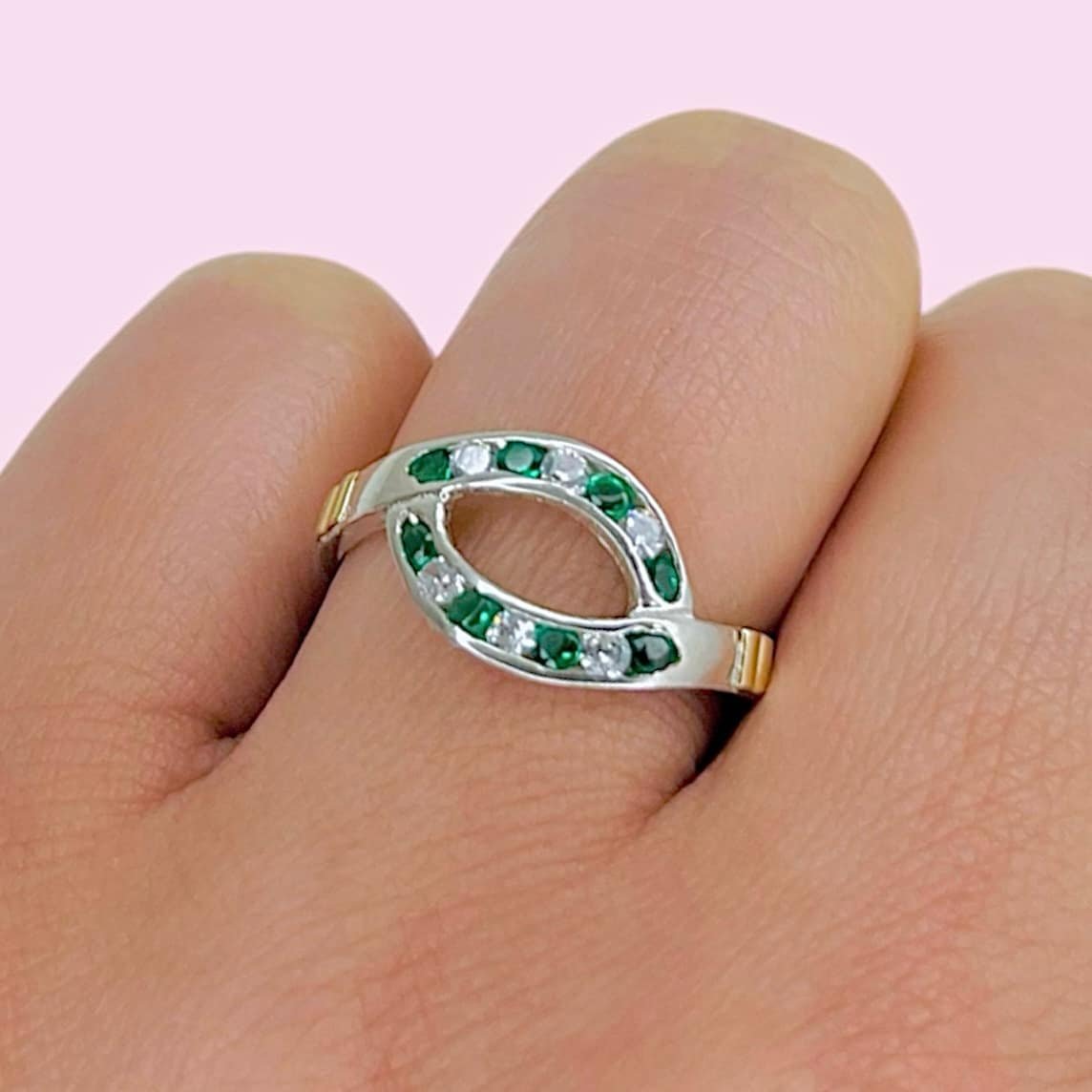 Anillo Ojo con cubic verde y blanco de Plata y Oro