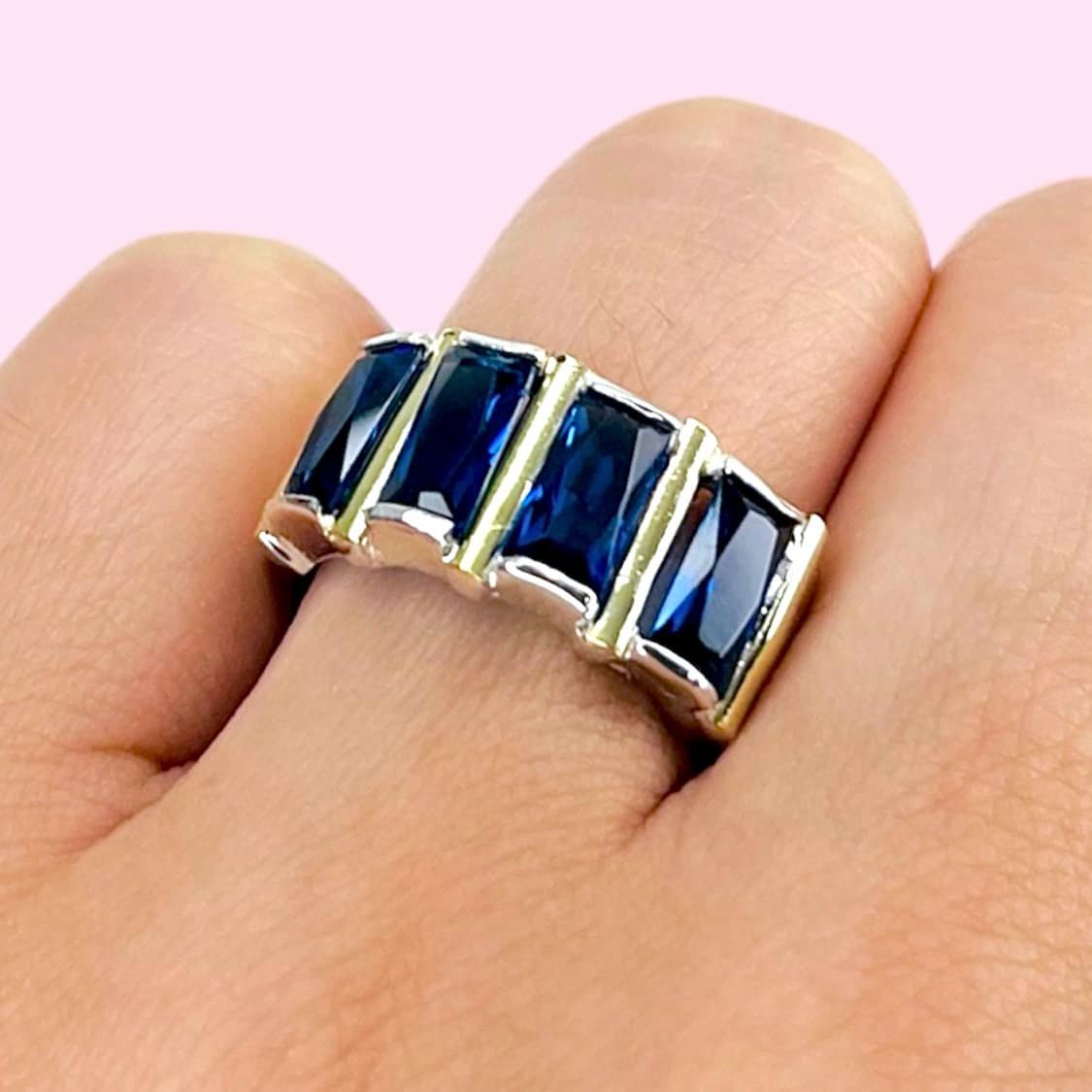 Anillo Cuatro Baguettes Azul Plata y Oro