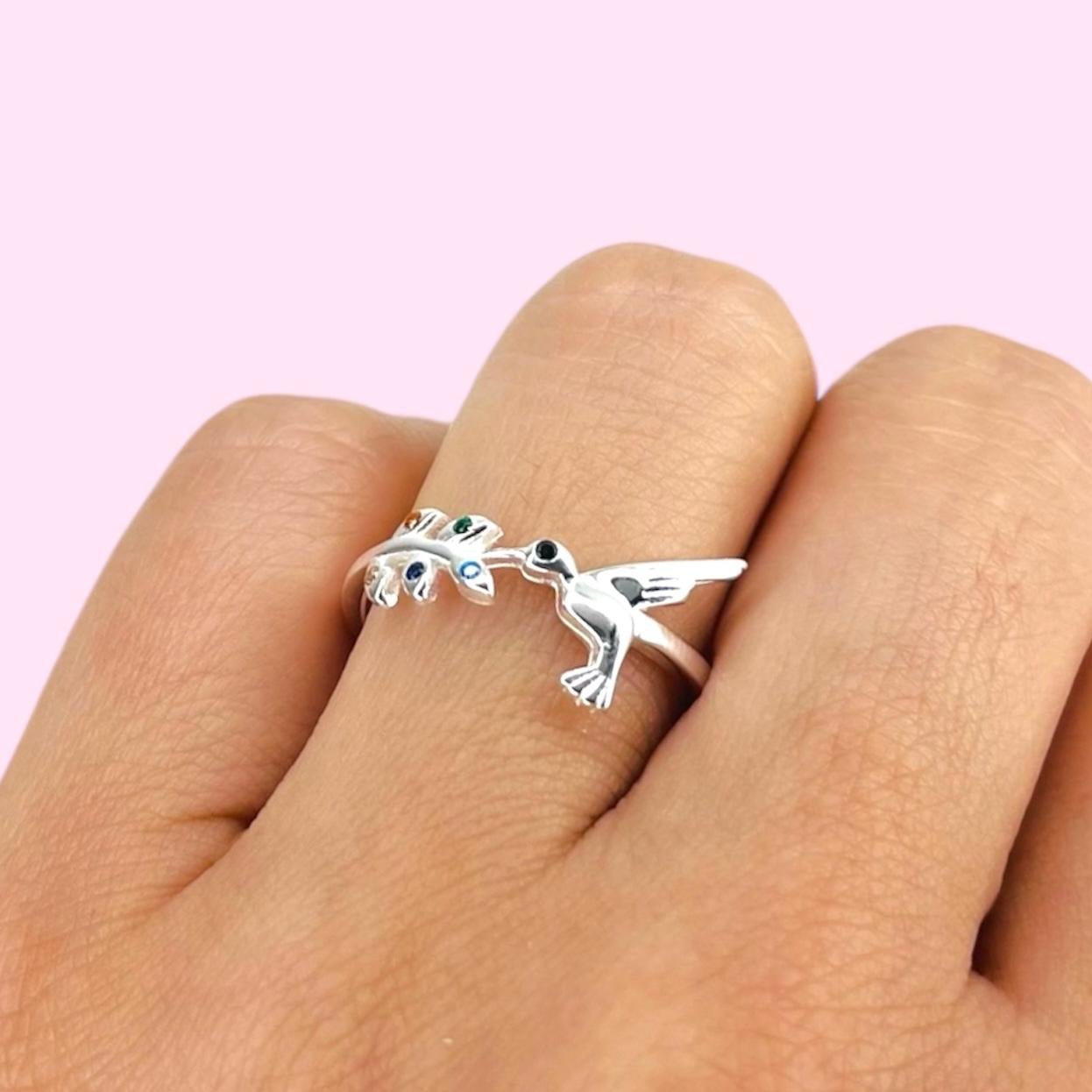 Anillo Colibri y hojitas cubic multicolor Plata Italiana