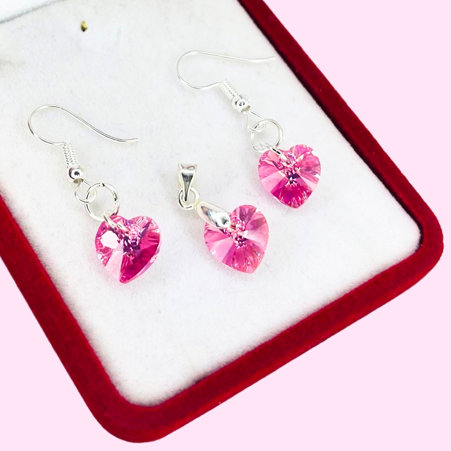 Conjunto dije y aros Swarowski Corazon Rose 10mm Plata 925