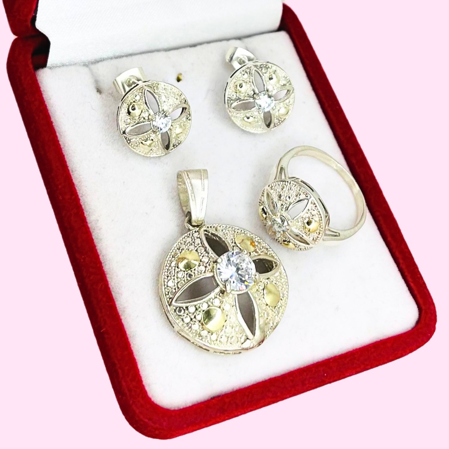 Conjunto Imperial Dije - Anillo y aros con cubic Blanco Plata y Oro