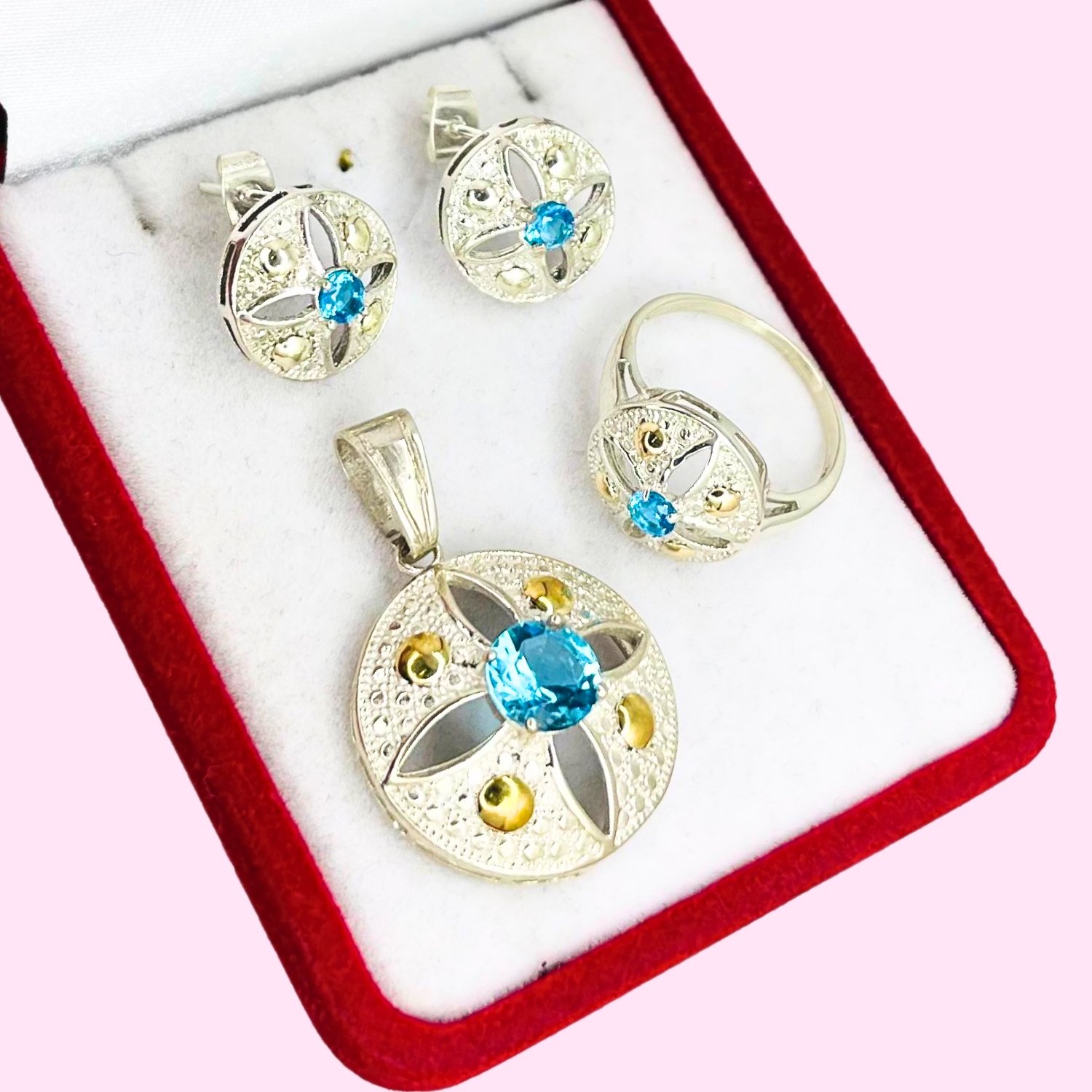 Conjunto Imperial Dije - Anillo y aros con cubic celeste Plata y Oro