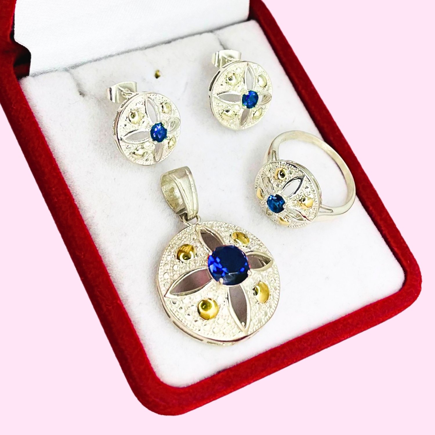 Conjunto Imperial Dije - Anillo y aros con cubic azul Plata y Oro